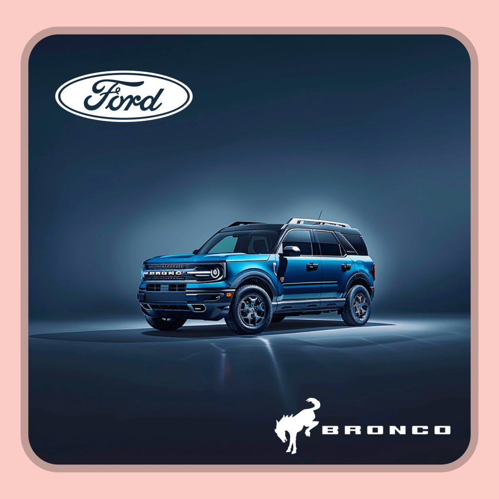 La paleta de colores del logotipo, una combinación de blanco y negro que se transforma en plateado brillante en el capó de los autos, complementa la imagen poderosa y segura que la Ford Bronco proyecta.
