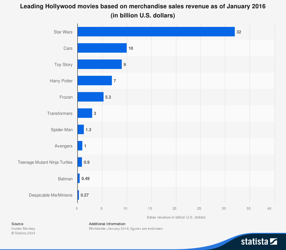 La estadística revela que a enero de 2016, la franquicia “Star Wars” lidera en ingresos por ventas de merchandising con 32 mil millones de dólares, seguida por “Cars” con 10 mil millones